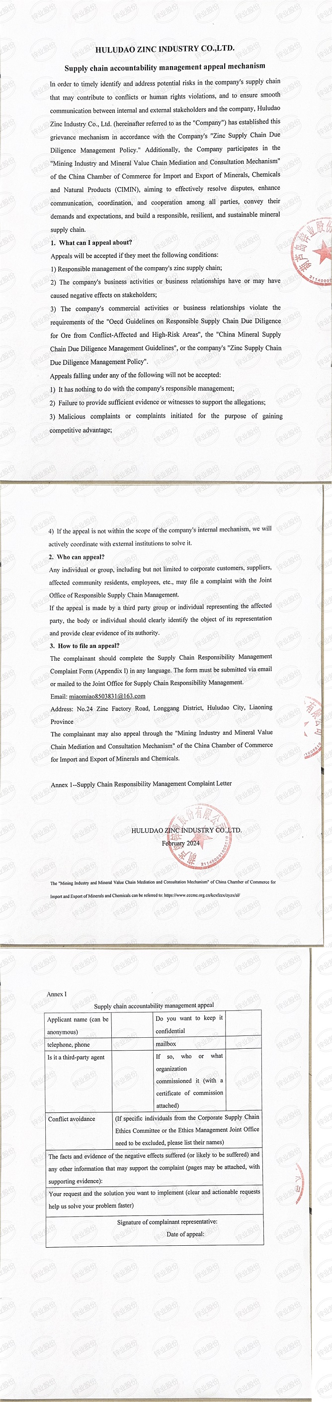 葫蘆島鋅業股份有限公司供應鏈盡責管理申訴機制(中英文)